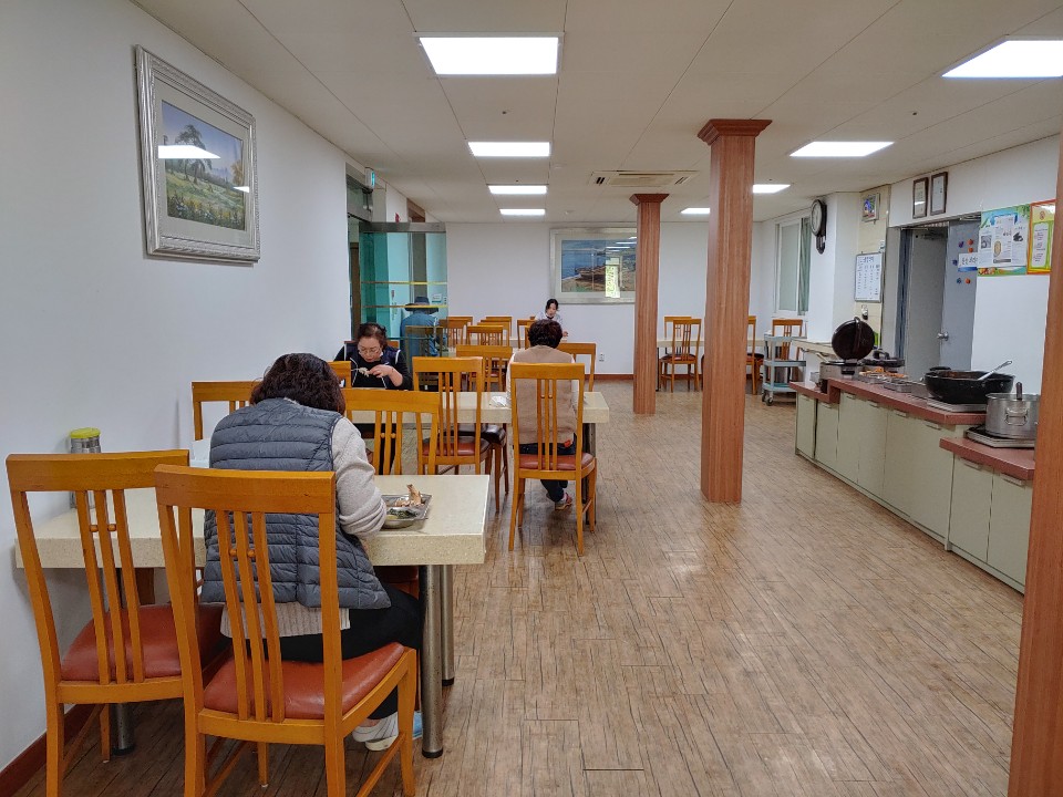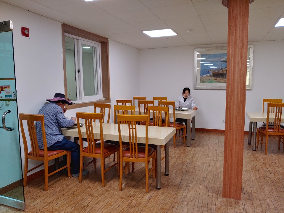 천우자애원 직원은 1층 식당에서 어르신 식사가 끝나면 2m 거리 유지하여 식사