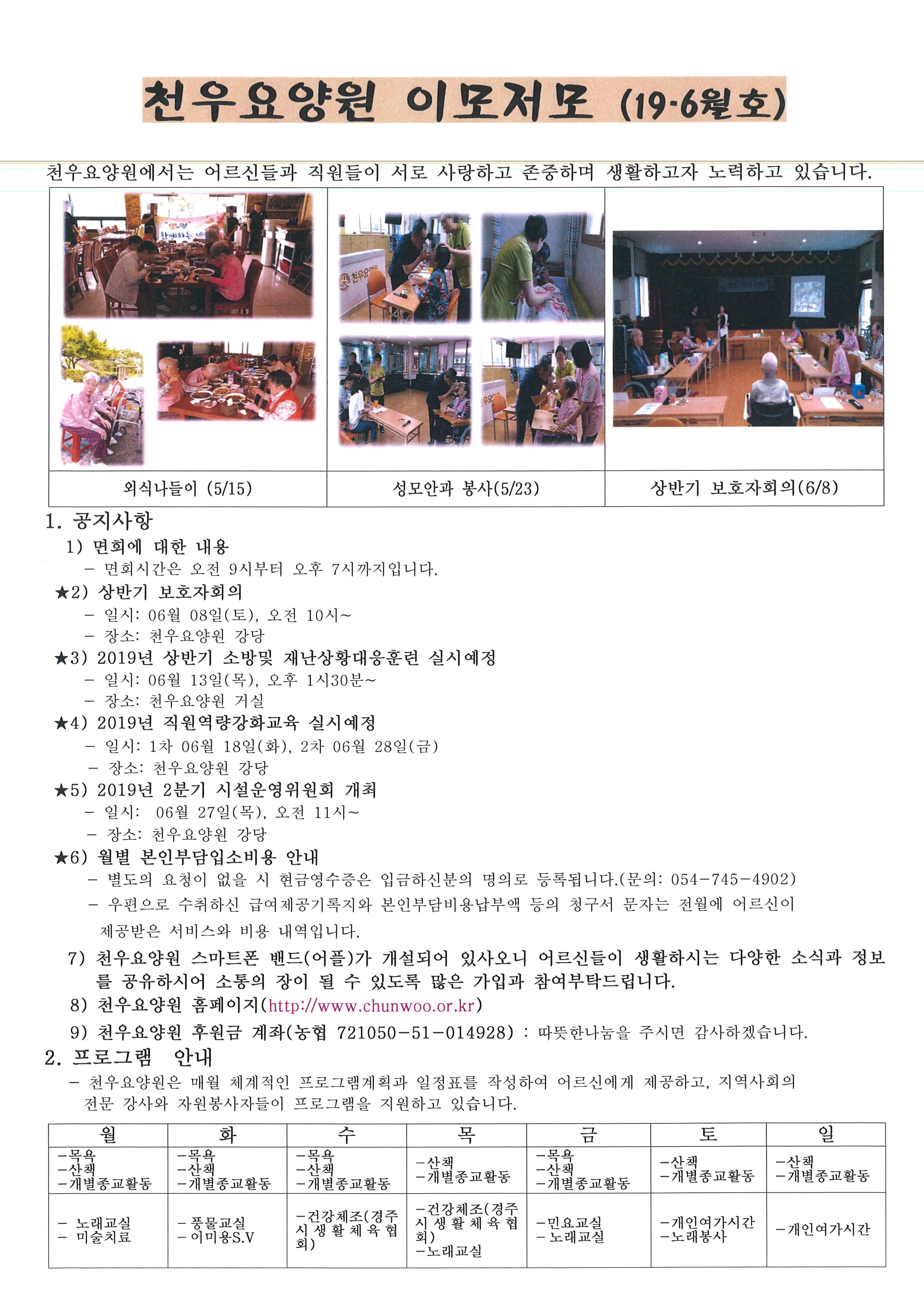 | 185 | 2019년 2분기 시설운영위원회 개최안내 | 천우요양원 | 1497 | 2019.06.03 17:58 |