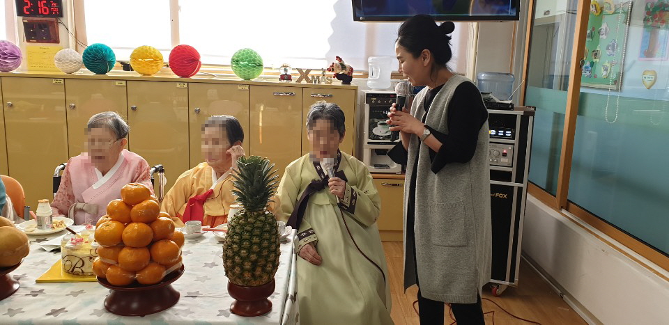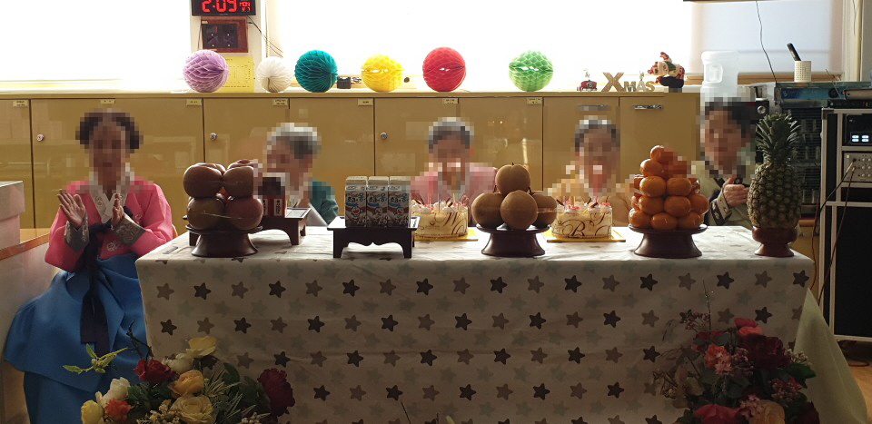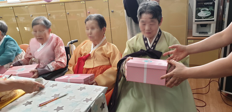 어르신들을 모시고 음력 12월 생신잔치를 하였습니다. 이번 달 생신이신 권*희 어르신께서는 생일을 축하해주어서 고맙다고 하시며 노래한곡 불러주셨습니다. 모*년 어르신께선 생신소감과 덕담한마디를 해주셨습다. 남*숙 어르신 이*화 어르신 박*조 어르신 모두 한복을 입으니 너무나 이쁘셨습니다.