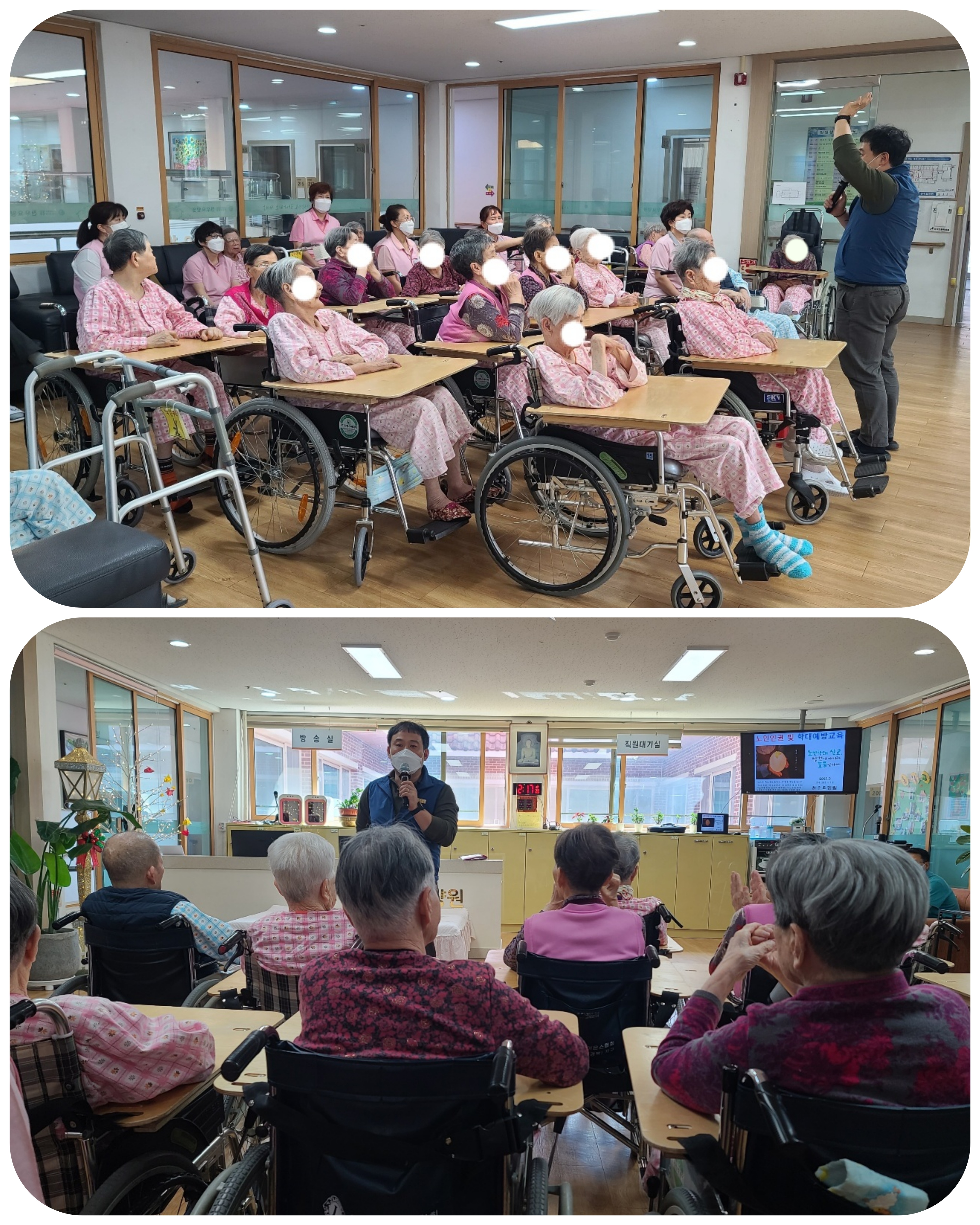 노인인권에 대한 올바른 정의및 학대유형을 파악하여 시설에서 일어날수 있는 노인학대을 사전에 예방하고자 아래와 같이 노인인권및 학대예방교육을 실시하였습니다.